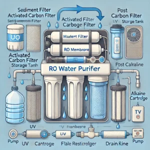 DALL·E 2024-11-17 11.19.43 – A detailed labeled illustration of an RO water purifier, showing its internal components including sediment filter, activated carbon filter, RO membra